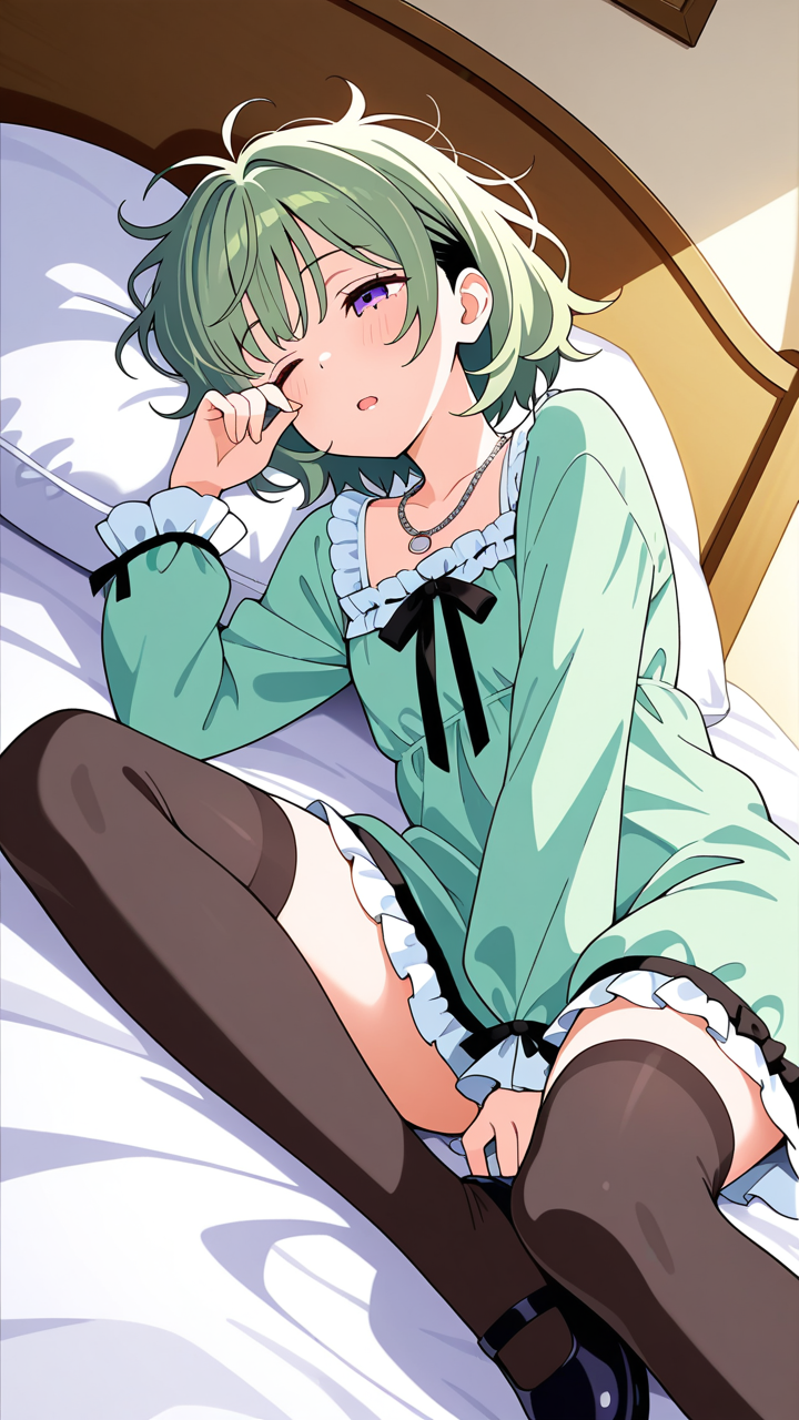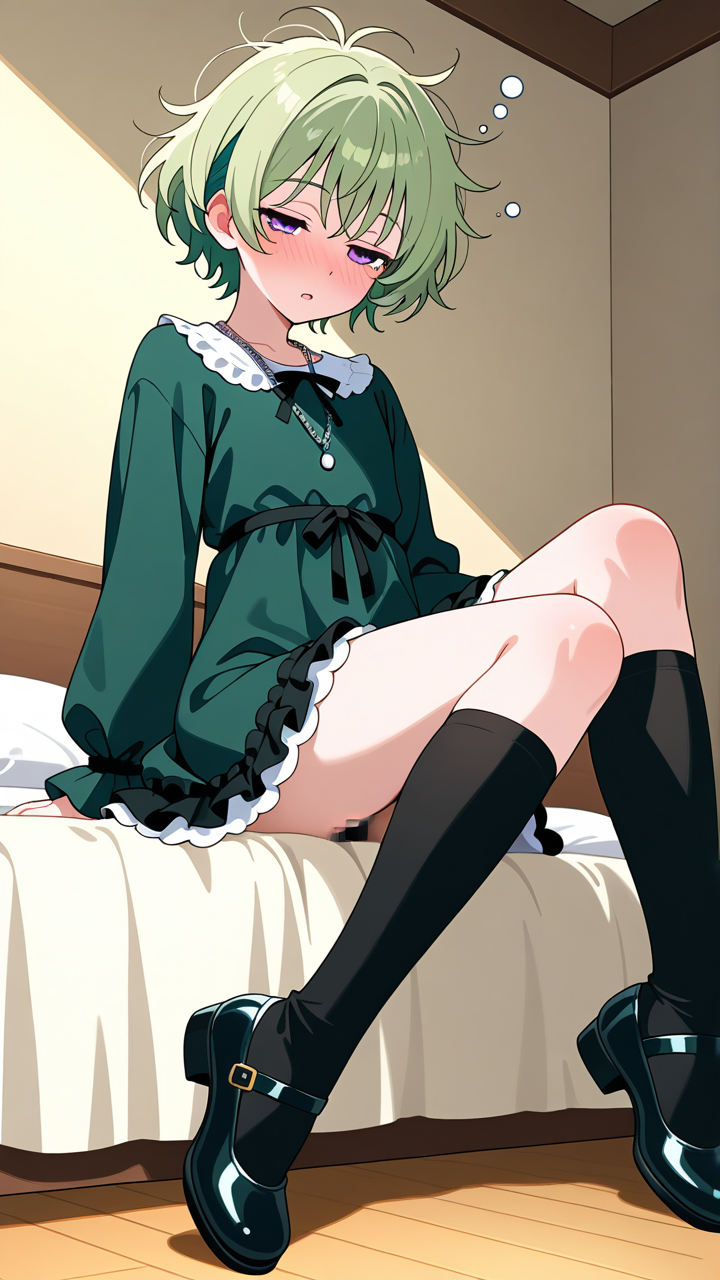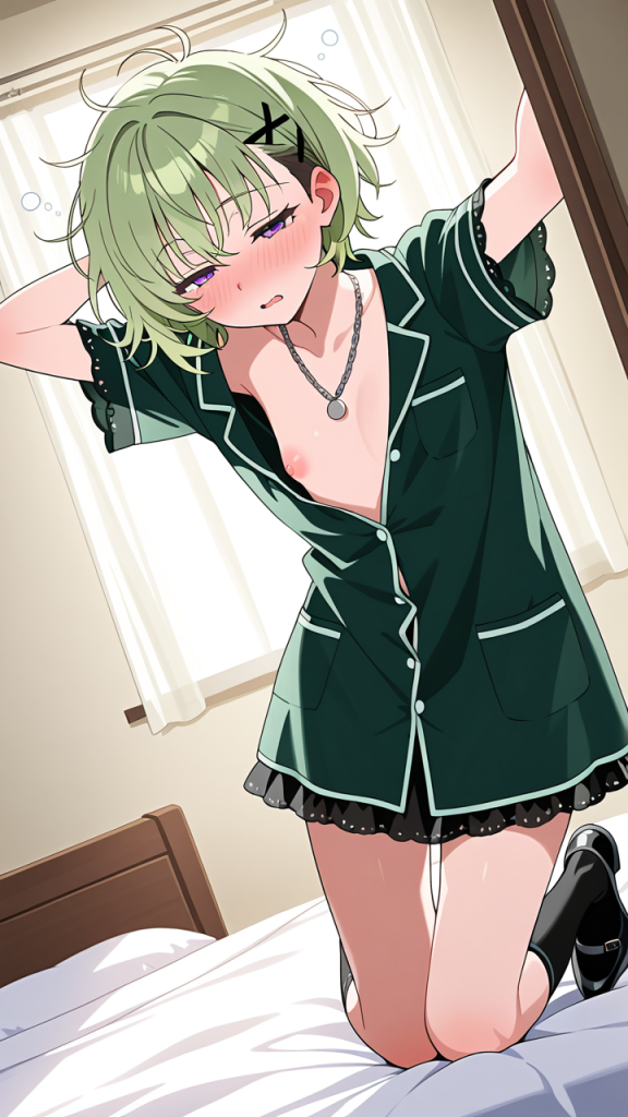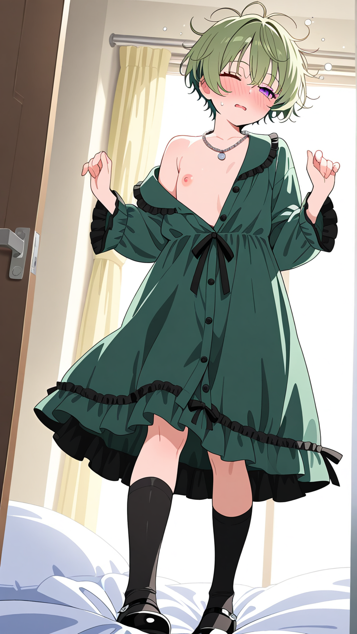 美少女,おっぱい,おしり,乳首,寝起き,パジャマ,朝,,緑髪の刈り上げショート、サイドはツーブロック,紫の瞳、切れ長の目,貧乳・長身,黒と深緑のゴシックロリータドレス、胸元に白いレースフリル、スカートに黒いリボン装飾、黒いニーハイソックス、深紫色のマリアンヌシューズ、首元に銀色のチェーンネックレス,腹黒系、冷徹で計算高い