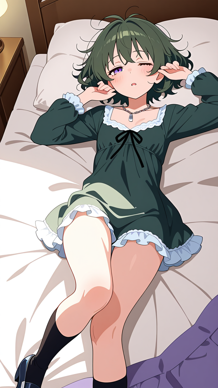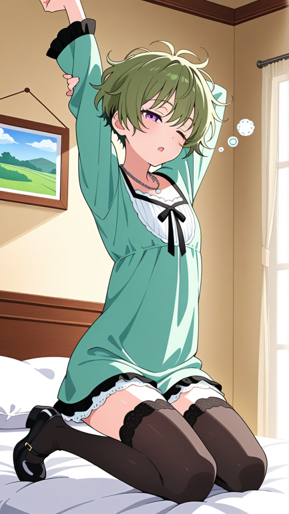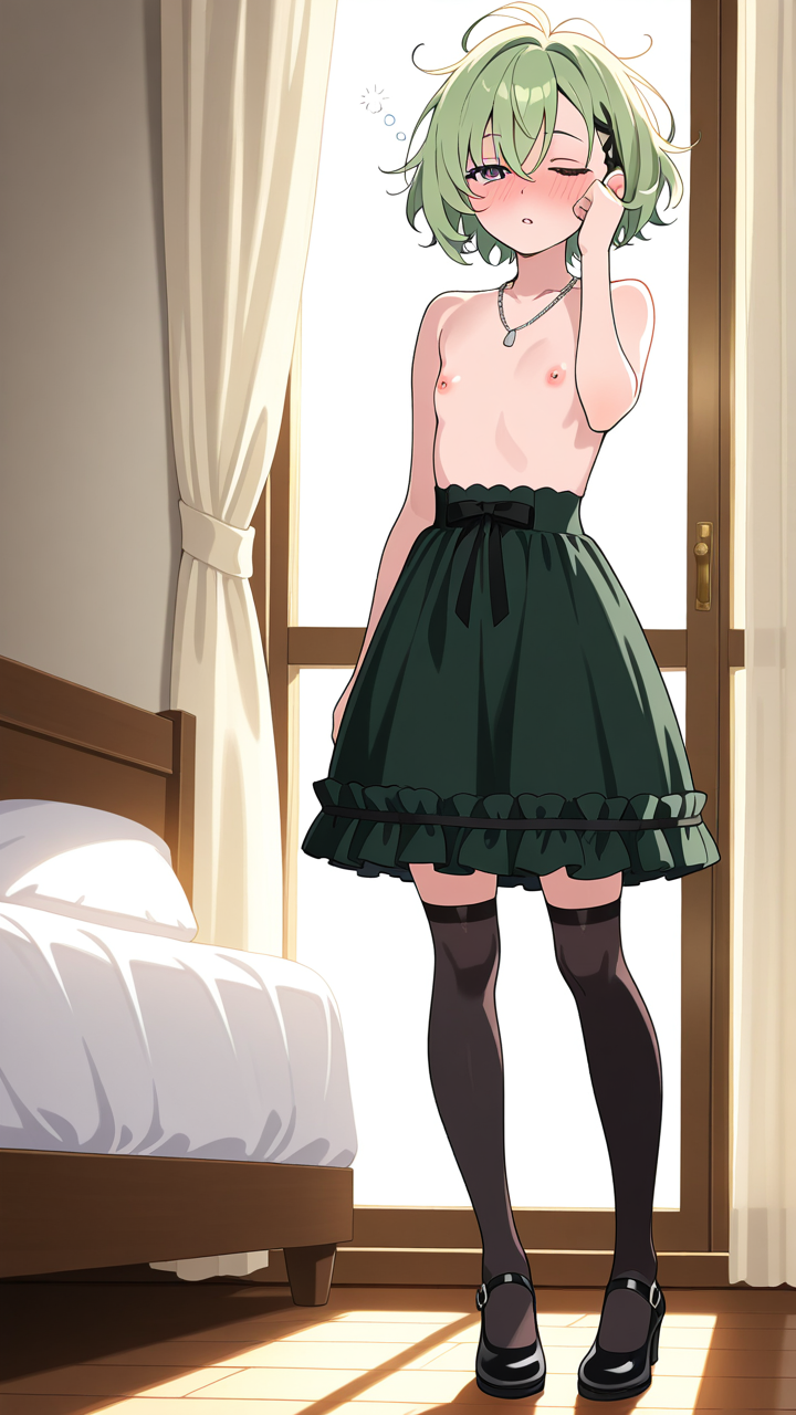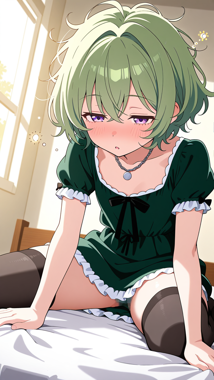 美少女,おっぱい,おしり,乳首,寝起き,パジャマ,朝,,緑髪の刈り上げショート、サイドはツーブロック,紫の瞳、切れ長の目,貧乳・長身,黒と深緑のゴシックロリータドレス、胸元に白いレースフリル、スカートに黒いリボン装飾、黒いニーハイソックス、深紫色のマリアンヌシューズ、首元に銀色のチェーンネックレス,腹黒系、冷徹で計算高い