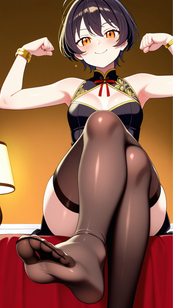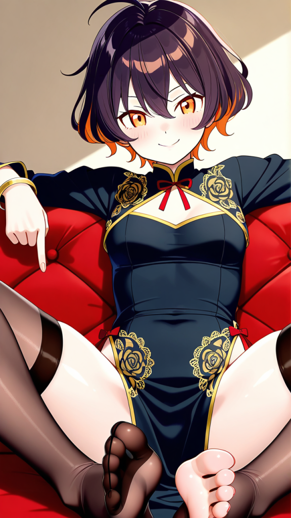 美少女,おっぱい,足コキ,足,脚,太もも,ニーソ,,マゼンタ色のくせ毛ショート,橙色の瞳、ハーフっぽい二重,背が高くスレンダー,黒地にゴールド刺繍のチャイナドレス、胸元に赤いリボン、黒いストッキング、黒いスリットパンプス、腕に金色のブレスレット,腹黒系、悪い笑み、狡猾な瞳