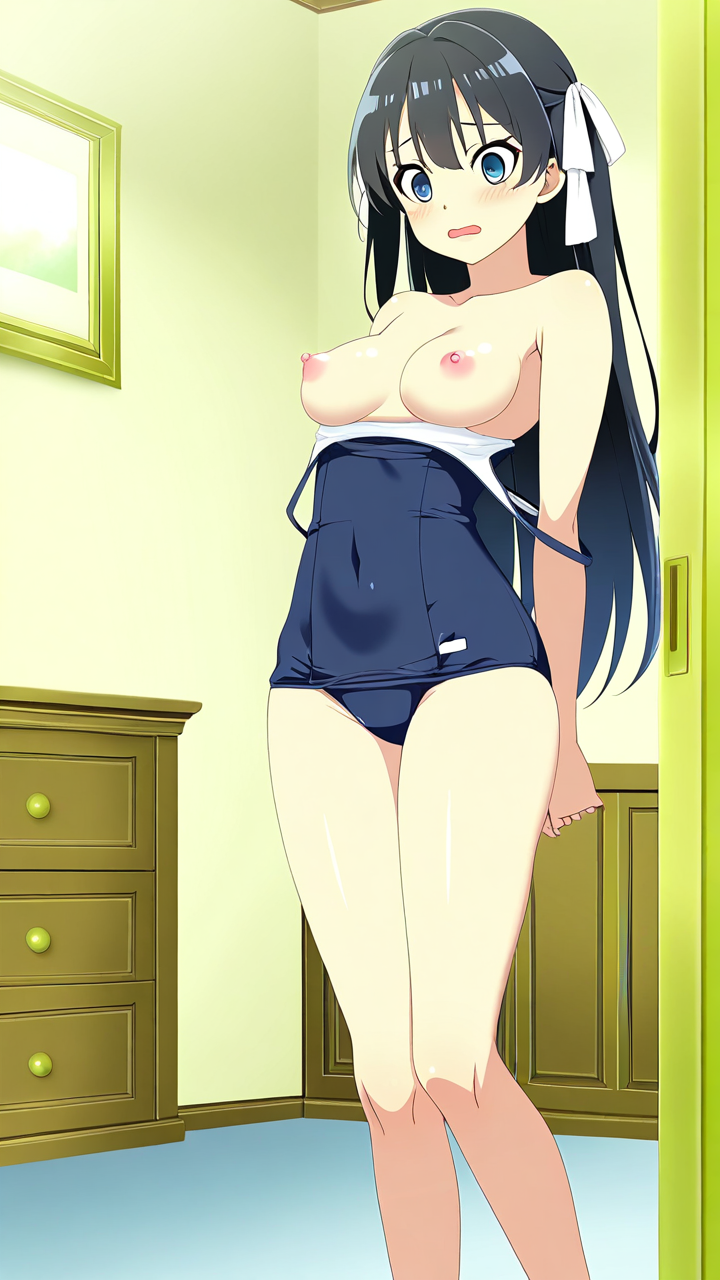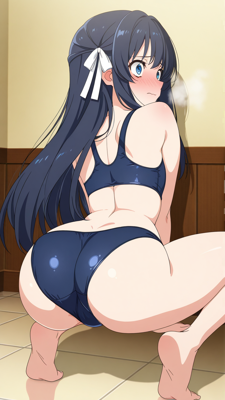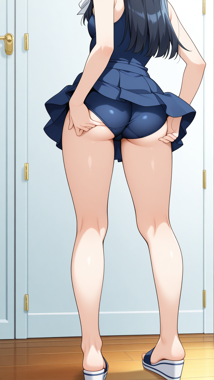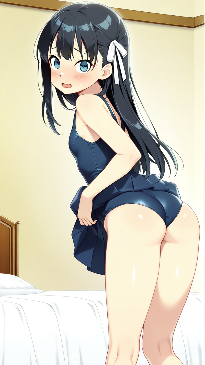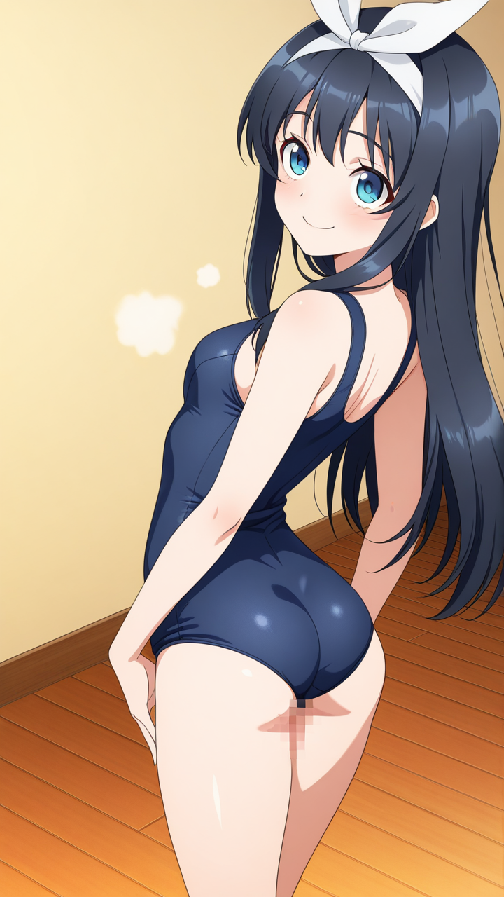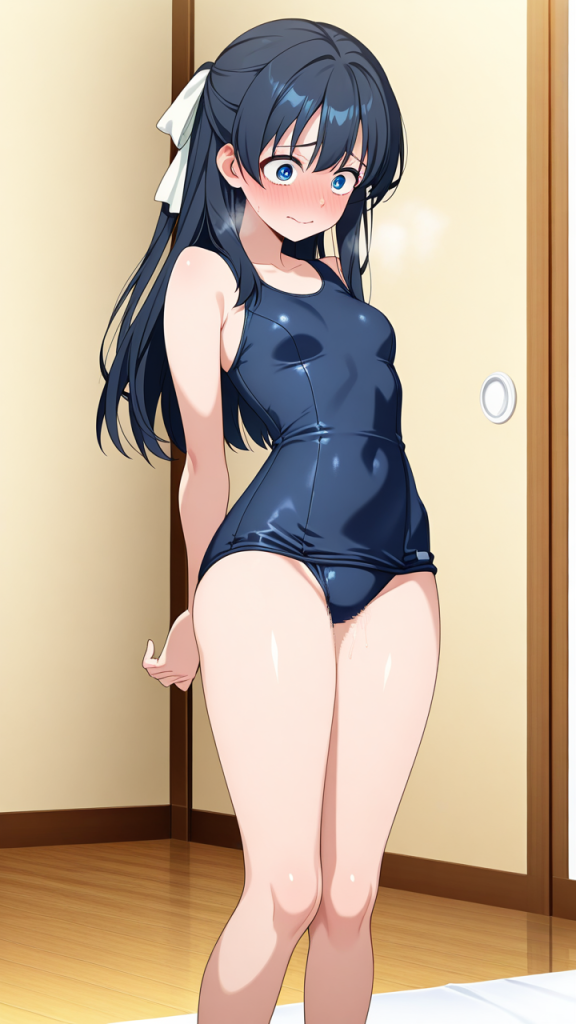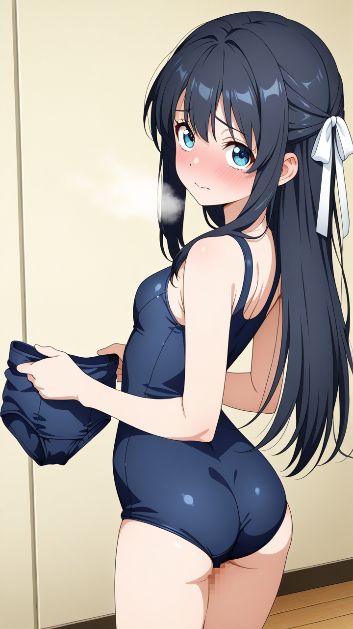 美少女,おっぱい,おしり,M字開脚,食い込み,乳首,パンツ,くぱぁ,バック,後背位,,黒髪のセミロング、毛先に軽くウェーブ,水色の瞳、つり目,細身・長身モデル体型,紺色のスクール水着、白いリボン装飾,クール・無口・冷徹な表情