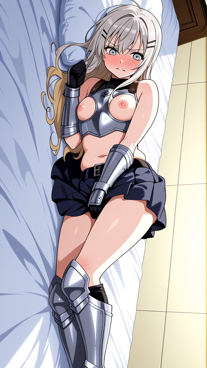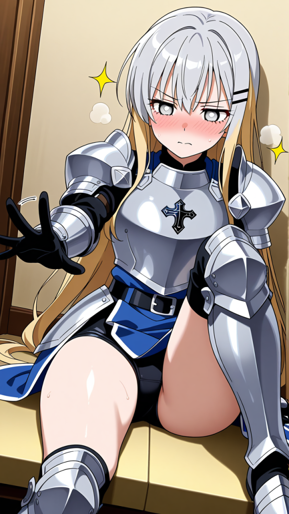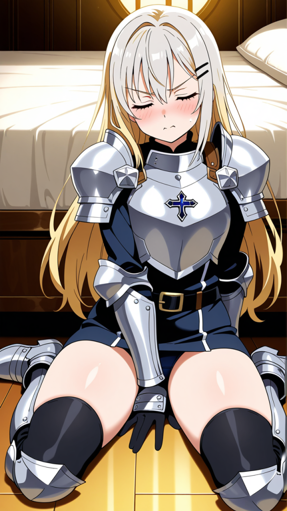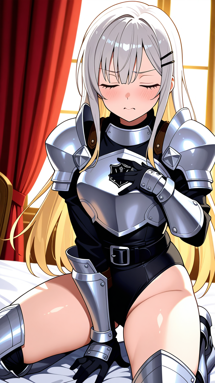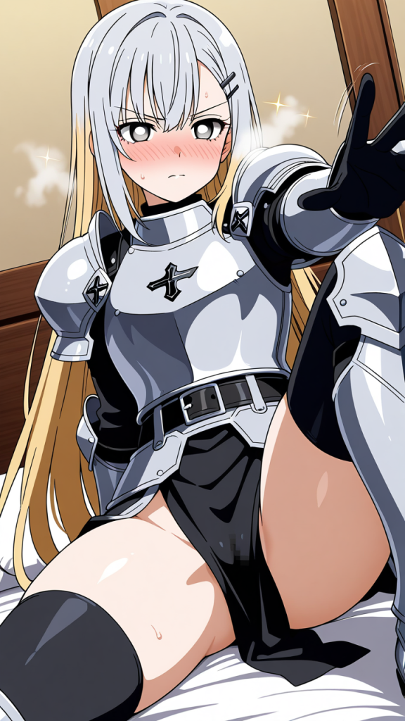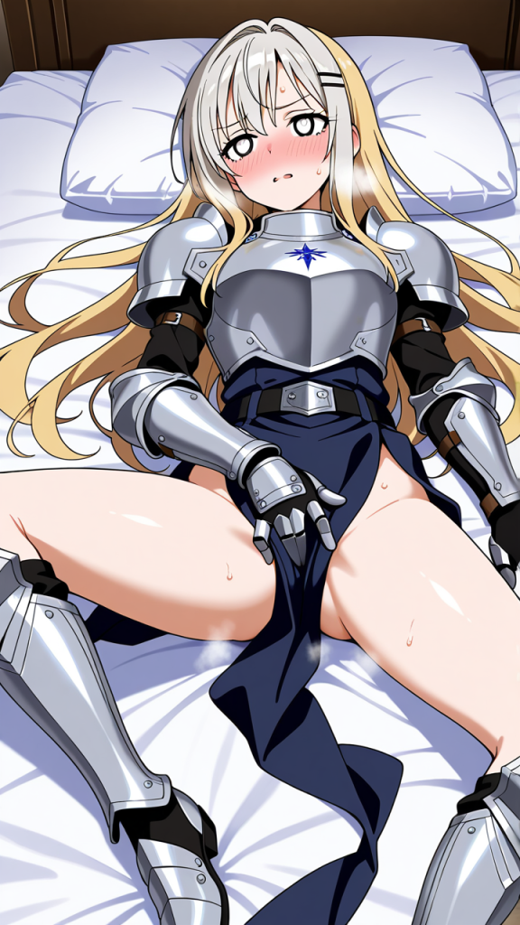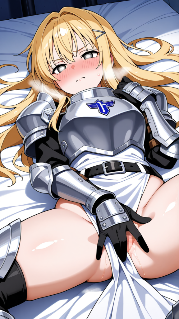 美少女,おっぱい,おしり,M字開脚,乳首,パンツ,くぱぁ,オナニー,自慰,指,マスターベーション,,金髪のセミロング、毛先に軽い外ハネ,銀色の瞳、たれ目,普通体型・少しむっちり,シルバーの騎士鎧、胸部に紋章、腕甲と脚甲は黒い鋼鉄製、腰に黒いベルト、髪留めは銀色のヘアピン、黒いロングブーツ,クール・無口、冷徹な表情