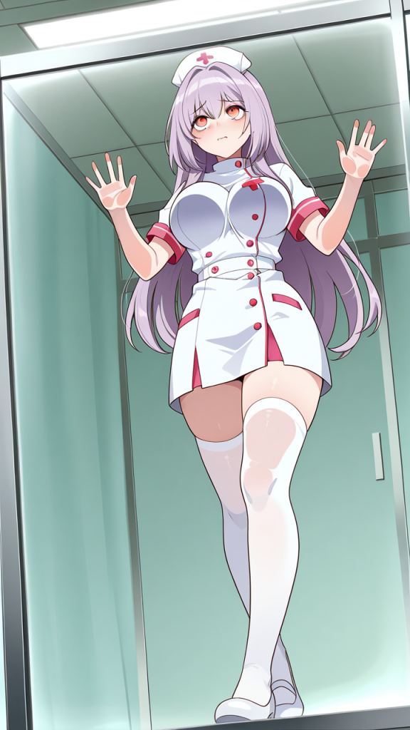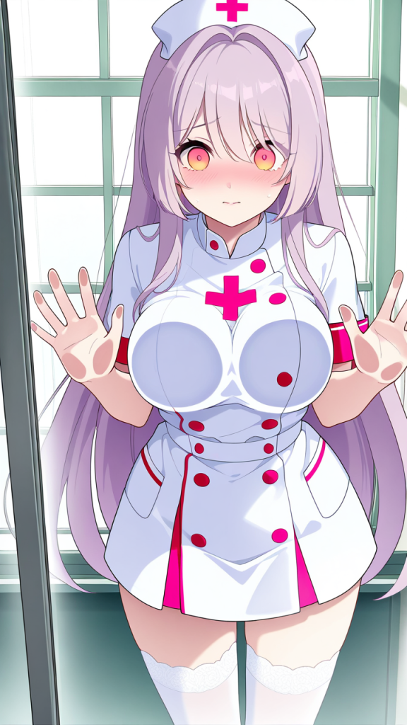 美少女,おっぱい,乳首,ガラス,押し付け,圧迫,胸,巨乳,貧乳,,マゼンタ色のロングストレート,橙色のたれ目,背が高くスレンダー,白と薄紫のナース服、胸部に赤い十字マーク、白いレースのヘッドドレス、白いニーハイソックス、白いナースシューズ,純粋無垢で優しく、少し儚げな雰囲気