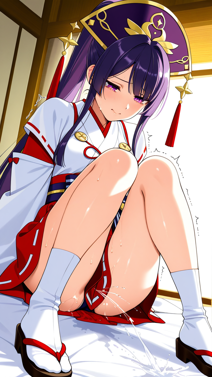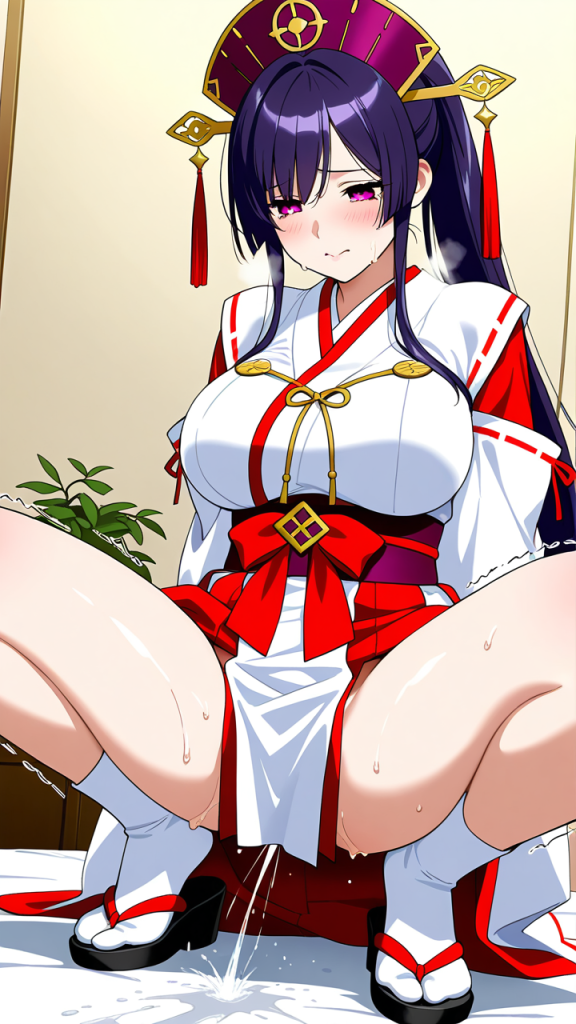 美少女,おっぱい,おしり,M字開脚,乳首,パンツ,くぱぁ,潮吹き,イキ潮,女性射精,びしょ濡れ,,紫髪のポニーテール、毛先に優しい丸み,深紅の瞳、垂れ目気味のハーフ目,背が高くスレンダー,朱色と紫のグラデーション巫女服、胸元に金色の装飾紐、腰に深紫色の帯、白い足袋、黒い草履、頭には紫のヘッドドレス付きの髪飾り,純粋無垢で優しく、神聖な雰囲気を纏っている