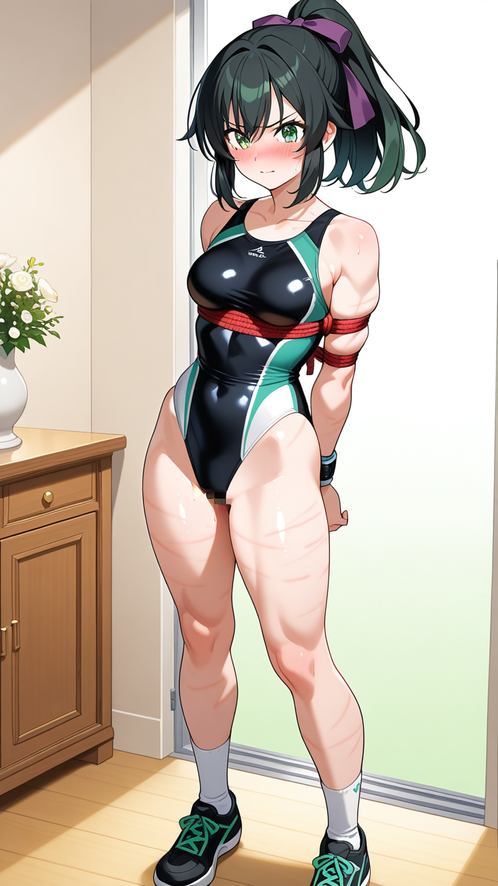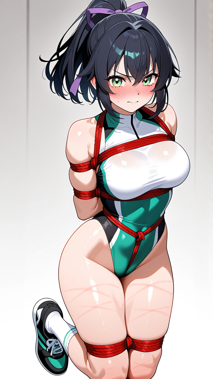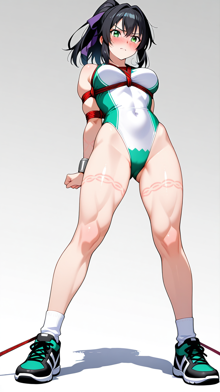 美少女,おっぱい,おしり,乳首,縛り,ロープ,拘束,SM,ボンデージ,,黒髪のハイポニーテール、毛先にふんわりした柔らかさ,翠色の瞳、丸くてキラキラした目,スポーティー・筋肉質,黒と白のカラーブロック体操服、袖と脇に金色のライン、首元に深紫色のリボン、腕に銀色のスポーツリストバンド、白いスポーツソックス、黒のスニーカー,毒舌だが仲間思い、ストレートな物言いと自信に満ちた表情