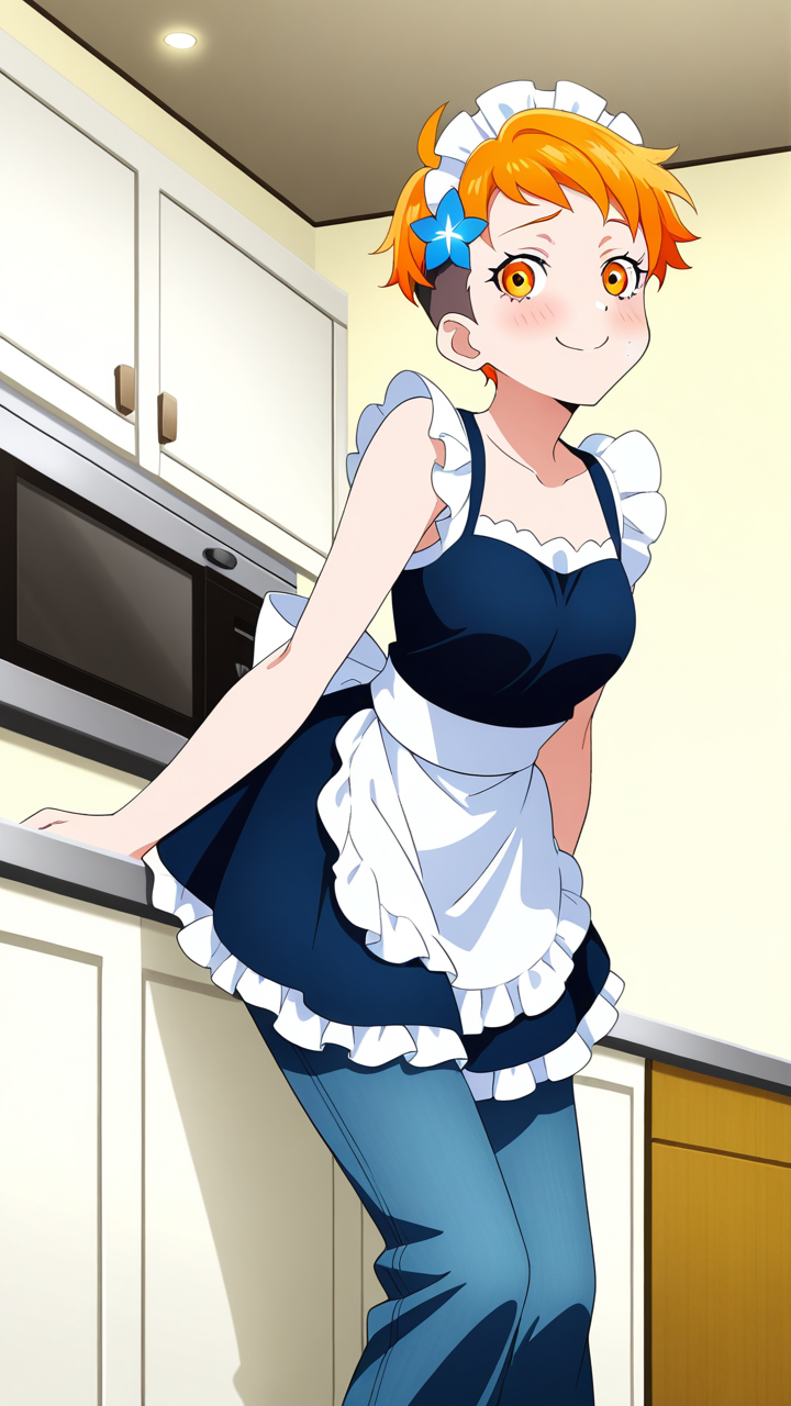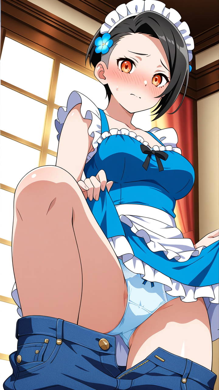 美少女,おっぱい,乳首,メイド,メイド服,コスプレ,,黒から青へのグラデーション刈り上げショート,橙色の切れ長の瞳,普通体型でやや丸みのある体つき,黒と白のカラーブロックカジュアルジャケット、青系のタンクトップ、デニムパンツ、青い花飾り,ミステリアスで無愛想、秘密めいた雰囲気