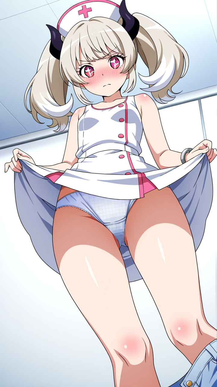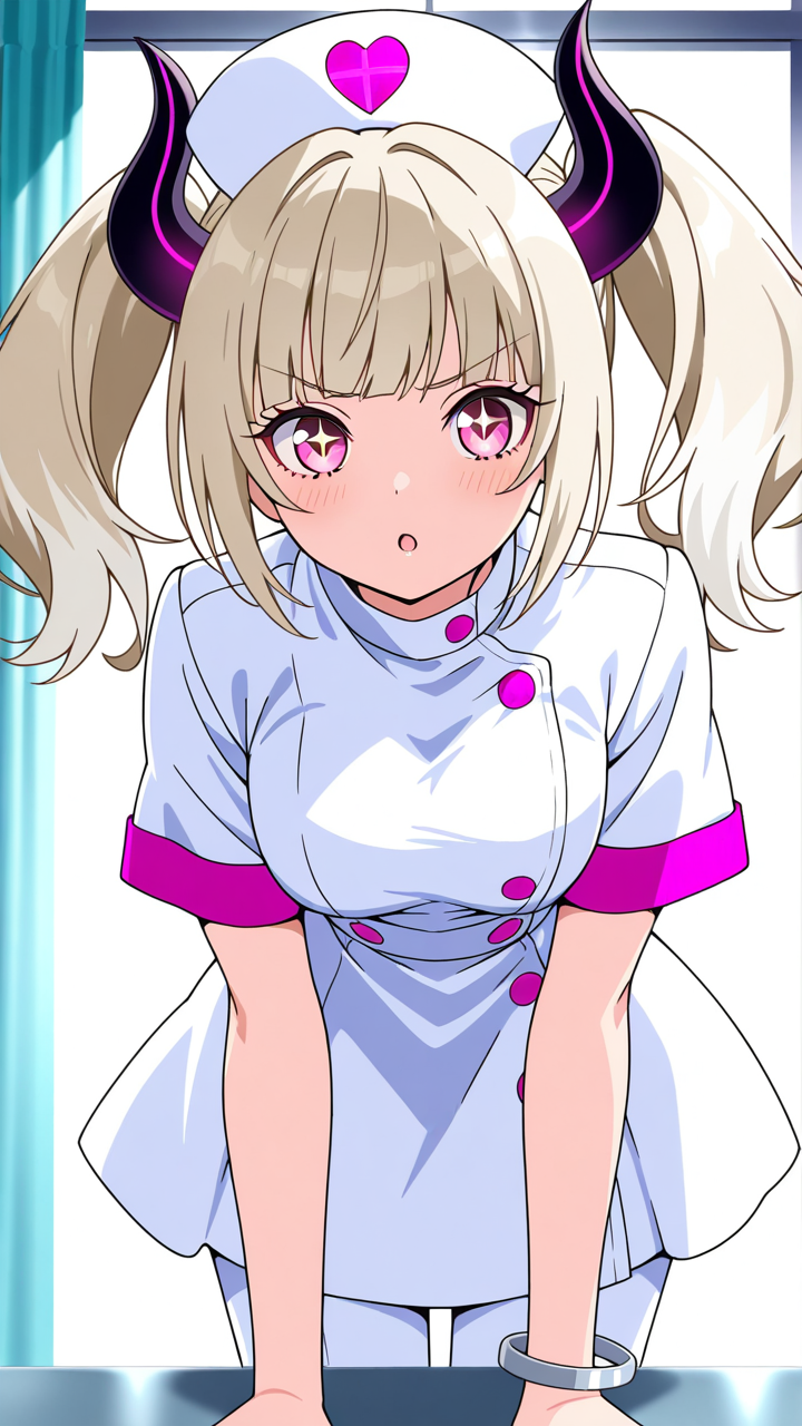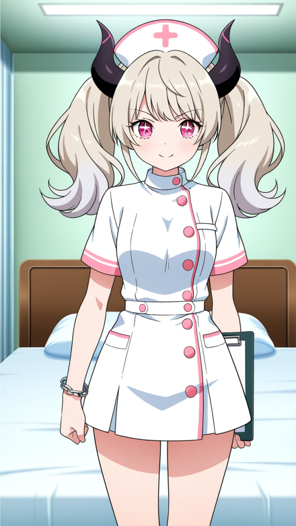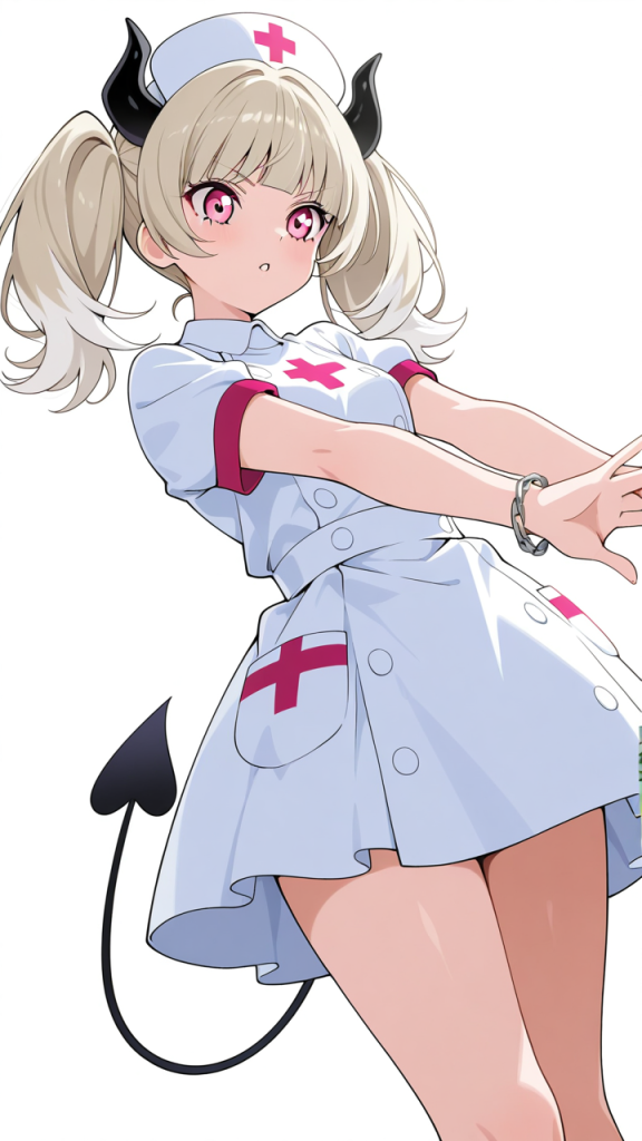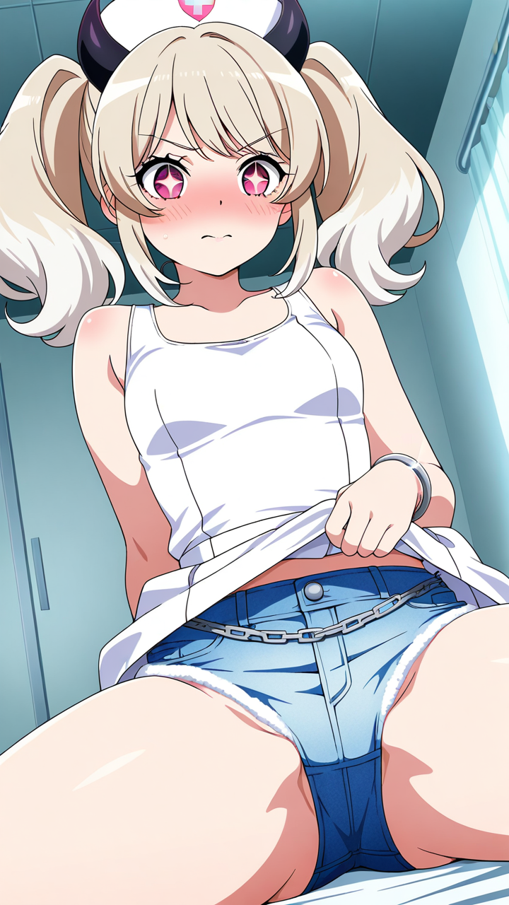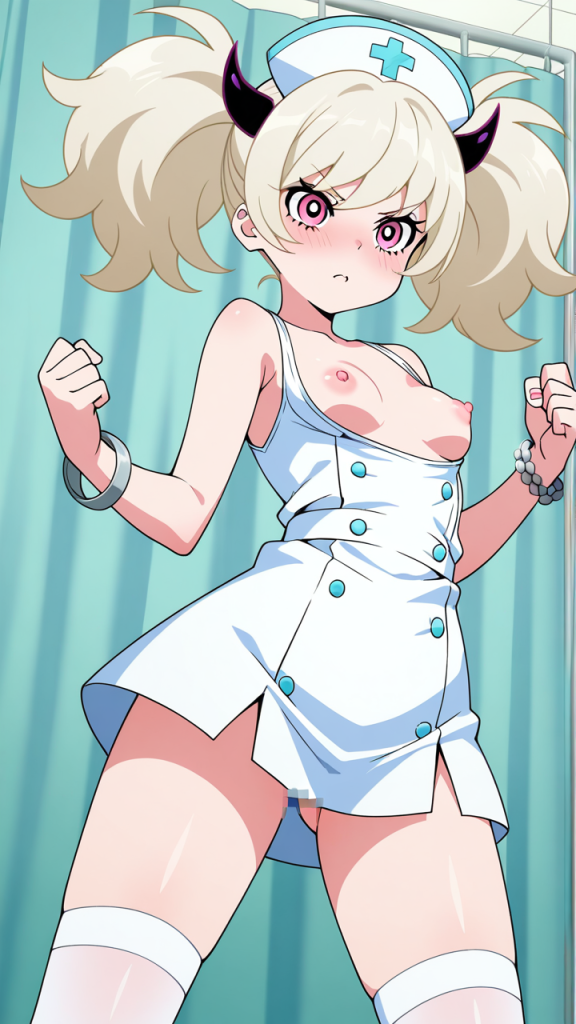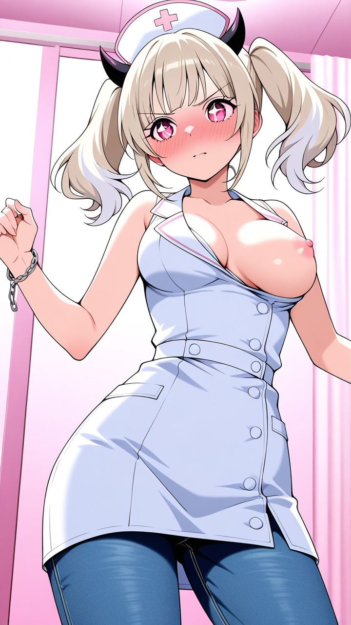 美少女,おっぱい,乳首,ナース,ナース服,看護師,コスプレ,,プラチナブロンドのツインテール、毛先にふんわりした柔らかさ,ピンクの瞳、丸くてキラキラした輝き,グラマラスな体型,白のタンクトップ、淡いデニムジーンズ、黒い悪魔の角カチューシャ、シルバーのチェーンブレスレット,勝ち気で負けず嫌い、明るく自信に満ちた表情