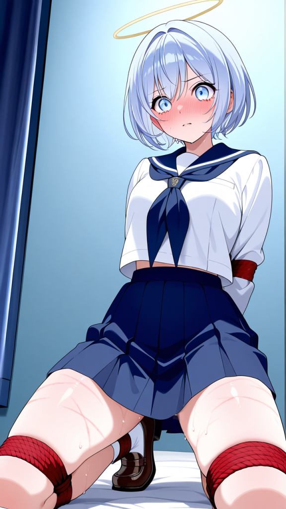 美少女,おっぱい,おしり,乳首,縛り,ロープ,拘束,SM,ボンデージ,,黒から青へのグラデーション、ショートカット,水色の瞳、切れ長の目,細身・長身モデル体型,紺色のブレザー学校制服、白いシャツ、紺のプリーツスカート、天使の輪,天然ドジっ子、不器用だが純粋で優しい