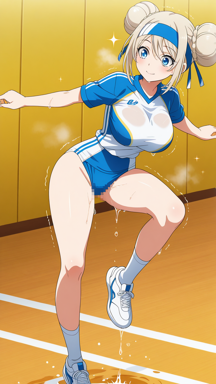 美少女,おっぱい,おしり,M字開脚,食い込み,乳首,パンツ,くぱぁ,おしっこ,お漏らし,放尿,,プラチナブロンドのお団子ヘア、毛先にふんわりした柔らかさ,青い瞳のつり目,巨乳・スレンダー,青と白のカラーブロックスポーツウェア、袖に白いライン、青い花飾りカチューシャ、白いスポーツソックス、白のランニングシューズ,元気系、明るくて活発、前向き