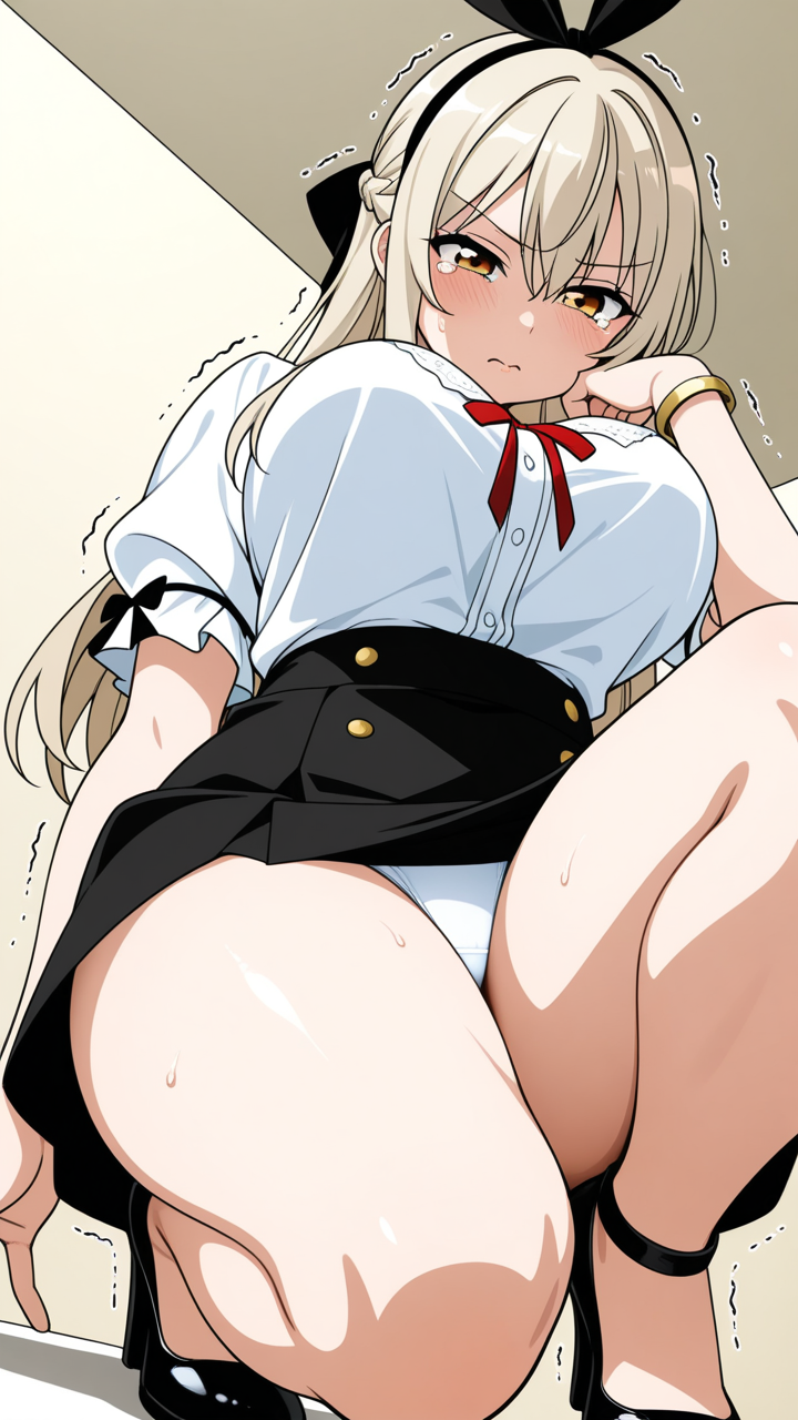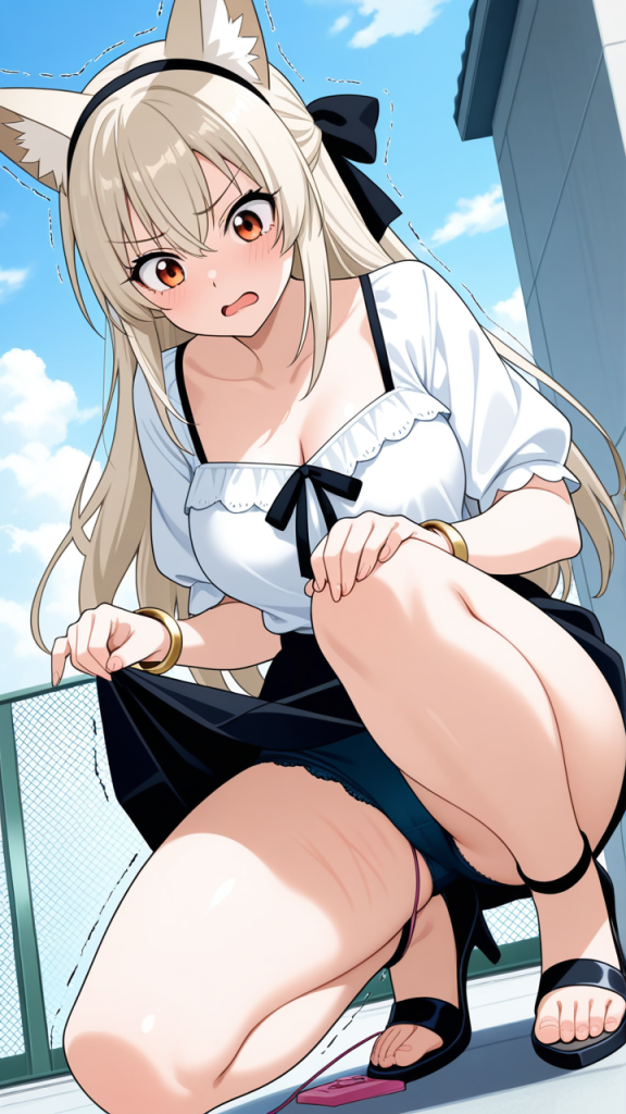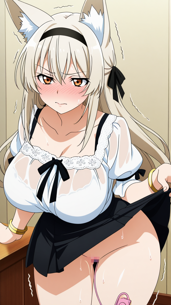 美少女,おっぱい,おしり,M字開脚,食い込み,乳首,パンツ,くぱぁ,バイブ,オナニー,,プラチナブロンドのハーフアップ、後ろでリボン結び,琥珀色のたれ目,巨乳・むっちり体型,白のシースルーブラウス、黒いミニスカート、狐耳カチューシャ、腕に金色のブレスレット,勝ち気で負けず嫌い、競争心が強く意地っ張り