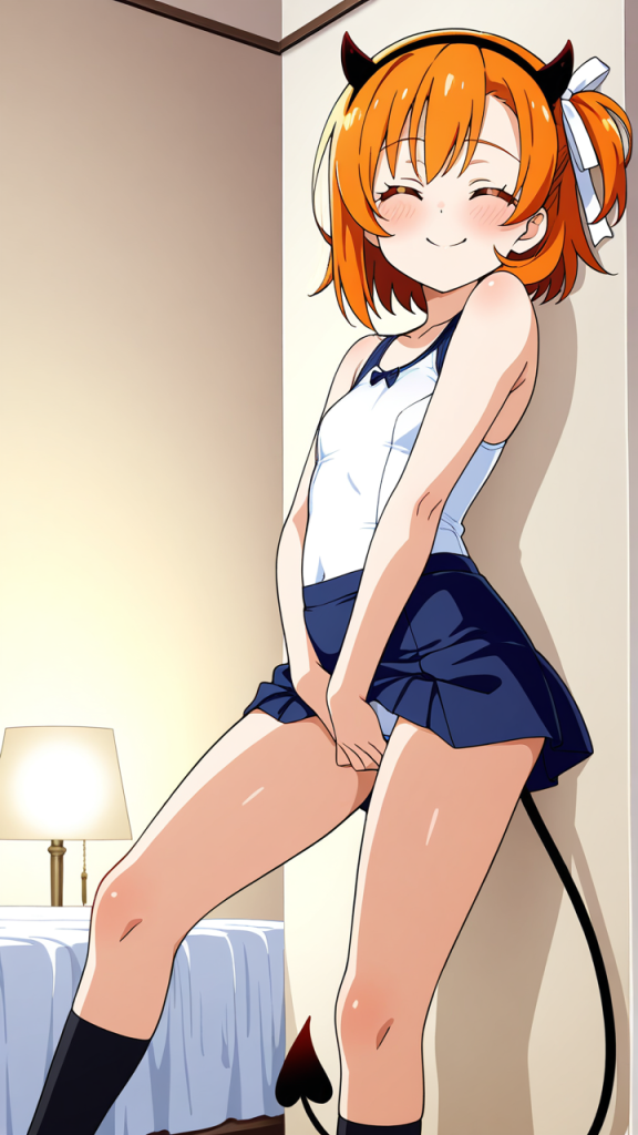 美少女,おっぱい,おしり,M字開脚,乳首,パンツ,くぱぁ,オナニー,自慰,指,マスターベーション,,オレンジ髪のサイドテール、毛先に軽くカール,橙色の瞳、細めのクールな目,小柄でむっちり,紅白のカラーブロックスクール水着、悪魔の角カチューシャ、腰に白いリボン装飾、黒いスポーツソックス,元気系、少しやんちゃで陽気