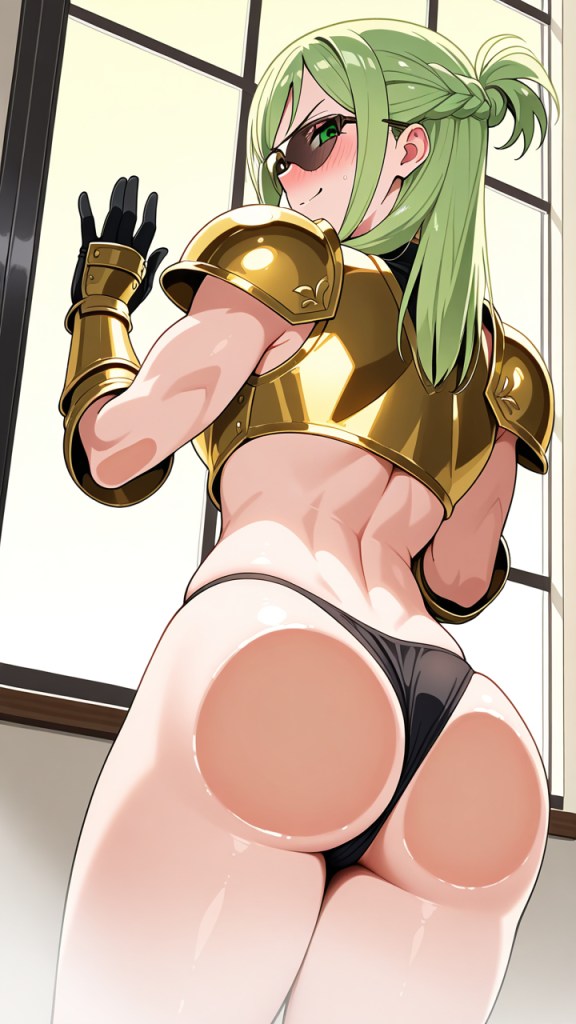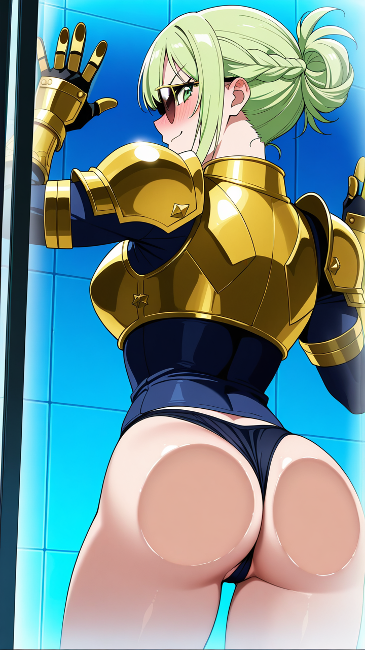 美少女,おしり,ガラス,押し付け,圧迫,ヒップ,くぱぁ,パンツ,,ライム緑のハーフアップ、毛先に軽くウェーブ,深緑の瞳、細めでクールな目つき,スポーティーで引き締まった筋肉質な体型,黒と金色の戦騎士鎧、肩甲に金色の装飾、UV対策のダークミラーサングラス、腕甲は黒い鋼鉄製,勝ち気で負けず嫌い、常に闘志に満ちた表情、自信に満ちた笑み