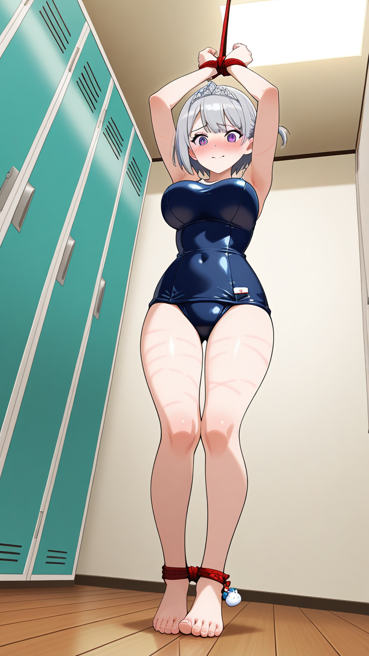 美少女,おっぱい,おしり,乳首,縛り,ロープ,拘束,SM,ボンデージ,,グレー髪のサイドテール、毛先に軽くウェーブ,紫の瞳、たれ目,巨乳・むっちり体型,紺色のスクール水着、シルバーのティアラ型ヘッドドレス、腰に白いリボン装飾,おっとり癒し系、柔らかい笑顔