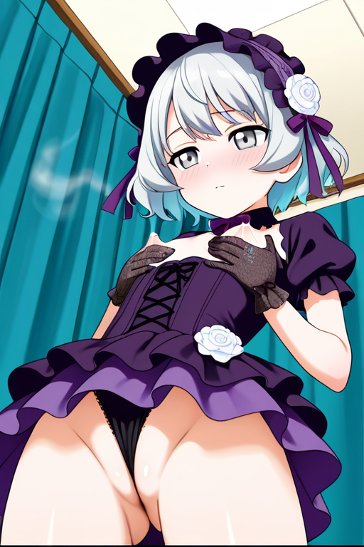 【エロ画像】AI_母乳_水色くせ毛と黒紫ドレスの、小さな暗黒の貴美少女,おっぱい,おしり,M字開脚,食い込み,乳首,パンツ,くぱぁ,母乳,ミルク,,水色髪のくせ毛ショート,銀色の瞳、ハーフっぽい二重,ロリ体型,黒と紫のゴシックロリータドレス...